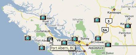 Pour trouver un site au moyen de l’interface de Google Maps, il faut connaître son emplacement géographique au Canada. Par exemple, pour trouver le site de Port Alberni, la carte doit être centrée au-dessus du sud-ouest de la Colombie-Britannique; il faut ensuite faire un zoom avant jusqu’à ce que l’icône de la caméra au-dessus de l’emplacement géographique de Port Alberni soit visible.