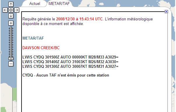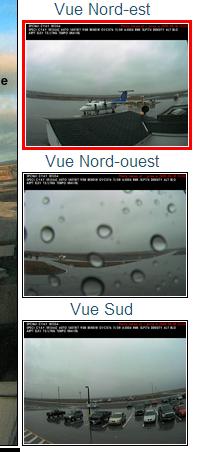 Pour visionner les plus récents rapports météorologiques d’un site en particulier, trouvez l’icône de la caméra qui représente le site souhaité et cliquez sur cet icône de caméra. Une fenêtre s’ouvre, avec deux onglets : une vue en zoom avant du site, avec les images actuelles de toutes les caméras (il s’agit de l’affichage par défaut), et une page de message météo, étiquetée « METAR/TAF ». Cliquez sur le deuxième onglet pour afficher la page des rapports météorologiques.