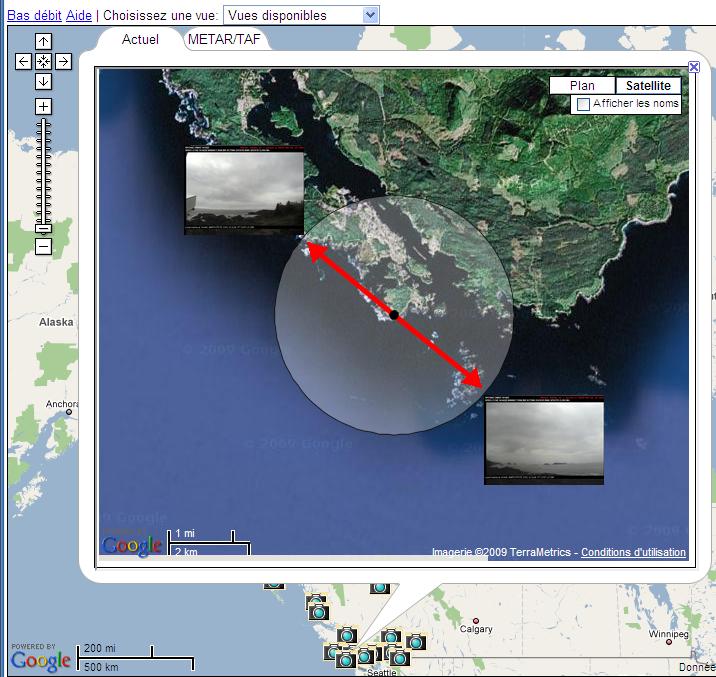 Il existe deux méthodes pour déterminer l’angle de visionnement de la caméra. La première consiste à examiner la flèche rouge sur la fenêtre contextuelle du site qui pointe à la vignette en question. La flèche rouge indique la direction de la vue de la caméra. La fenêtre contextuelle du site est centrée au-dessus de l’emplacement exact des caméras météorologiques.